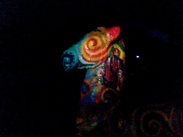 Nach dem Gummibären-Cache bot sich der Pferdchen-Cache doch sehr an, also machten wir uns gleich auf den Weg.Da das Pferdchen zunächst von Jungmuggels belagert war, machten wir uns zuerst auf die Suche nach dem Cache. Das GPS war sich leider nicht so ganz einig, so dass wir erst mit dem Hint fündig wurden. Dennoch waren wir noch nicht am Ziel, da die Cachebox von achtbeinigen Tiermuggels bewacht wurde. Mit einem Stock liessen sich jedoch auch die vertreiben, so dass wir den Cache schliesslich auch heben konnten [#32], statt ihn nur zu sehen... Zurück am Pferdchen waren zwar keine Muggels mehr da, jedoch hatten die offensichlich die Sonne geklaut! In der Dunkelheit entstand so ein lustiges Bild des vielfach Taschenlampen-bestrahlten Pferdchenkopfs (mässige Qualität, war nur mit dem Handy) vor pechschwarzer Nacht. Viele Grüsse, Die Schokokekse